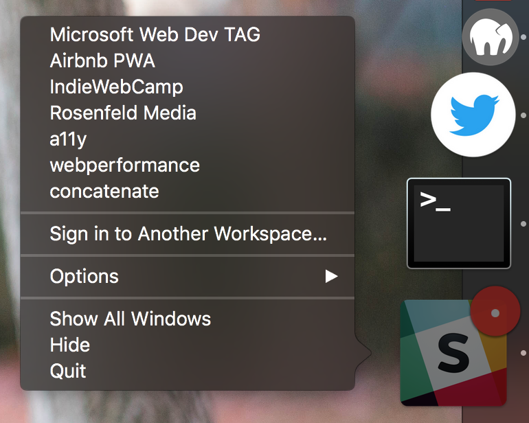 This menu provides a list of Slack “workspaces” the user is signed into, followed by a link to “Sign into another workspace.”