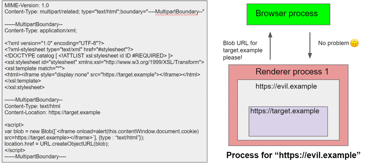 This was a perfect bug to find a Site Isolation bypass because this behavior was similar to a compromised renderer where you can overwrite the origin information in the renderer process, but that wouldn’t allow an attacker to bypass process isolation by Site Isolation. By using this bug, we can test which API wouldn’t care about a faked origin and allow us to access other origin’s information. So, while testing it myself, I also told Masato about this interesting behavior. And soon, he found a bug 😊 It turns out that you can create a Blob URL with a spoofed origin and navigating to that Blob URL would allow us to access cookie of the target site.