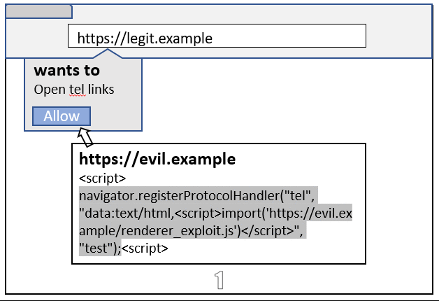 Another idea I had was, what if I can use registerProtocolHandler API to navigate any protocol to some bad URL (e.g. Data URL)? So, I checked their implementation, and following restrictions were bypassable/spoofable.