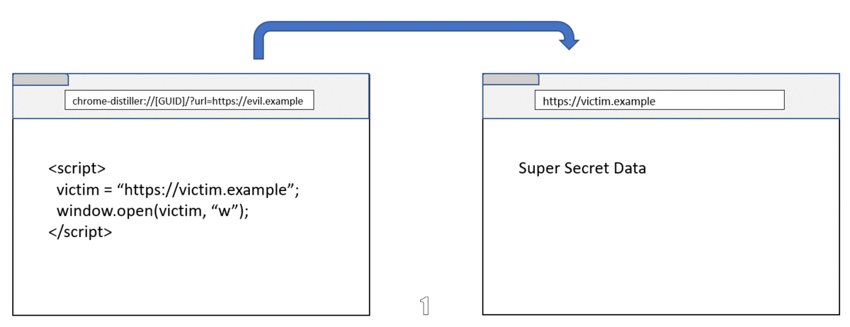 - Sergei noticed that when a JavaScript URL is opened using the openWindow bug, the resulting process doesn’t get a Site assigned. And Chrome would reuse the same process for navigation in that window. Which means an attacker can compromise a renderer process by opening JavaScript URL, and then ask Chrome to navigate to any site while attacker is in full control of that process. This is essentially a UXSS, though it’s much stronger primitive than a UXSS (because it can call native functions as opposed to JS functions).