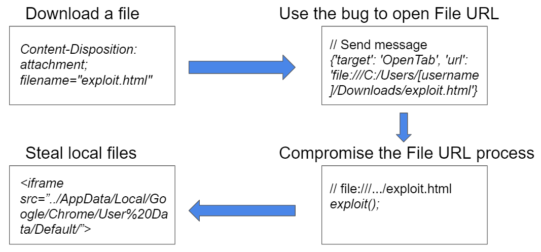 - An attacker downloads an HTML file containing a renderer exploit. Then, the attacker can open the downloaded file using the openWindow bug. Because any File URL is treated as same-site, the downloaded file can now read any local file and send that content to a remote server.
